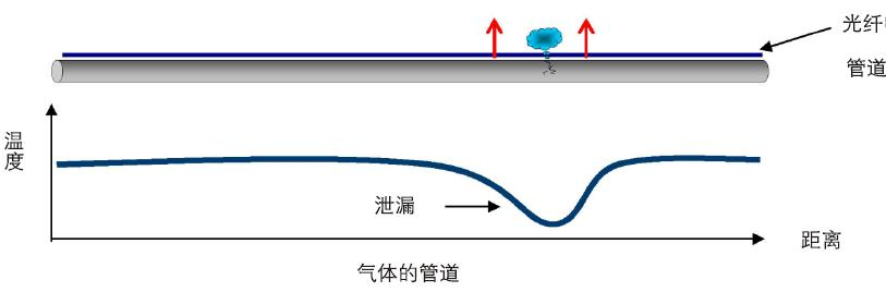 油氣管道泄漏時會引起泄漏點(diǎn)周圍溫度的變化,通過分布式光纖溫度傳感系統(tǒng)可以準(zhǔn)確定位泄漏點(diǎn)。在天然氣管線介質(zhì)泄漏受壓情況下,氣態(tài)物質(zhì)導(dǎo)致的泄漏點(diǎn)的低溫,是由物質(zhì)的物理性質(zhì)、工藝條件和周圍環(huán)境所決定的。這些點(diǎn)的溫度異常可通過分布式溫度測量而獲得,并有很好的溫度、距離和反應(yīng)時間精度。管道本身發(fā)生泄漏事故時,泄漏出的天然氣由于存在壓力,會向管道周圍發(fā)出噴射狀的氣體。如果能對整條天然氣管道在現(xiàn)有的壓力、流量探測技術(shù)基礎(chǔ)上,利用沿管道敷設(shè)的通訊光纜,接入分布式光纖測溫傳感主機(jī),就能夠?qū)崟r探測到泄漏點(diǎn),并進(jìn)行泄漏點(diǎn)的定位和報警顯示。