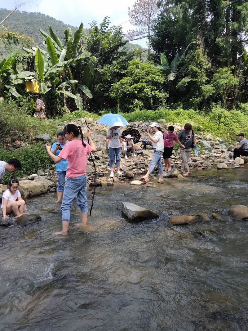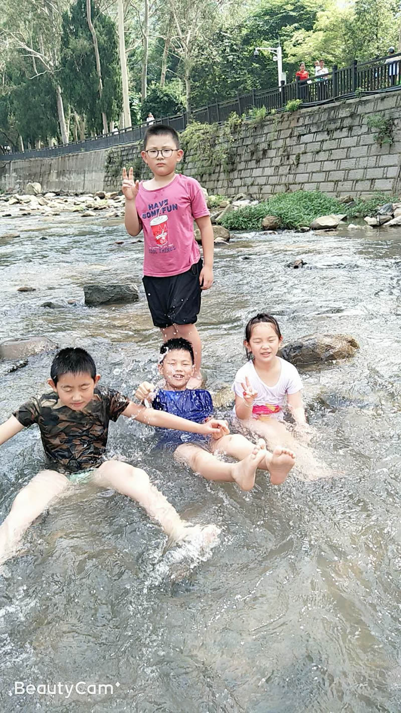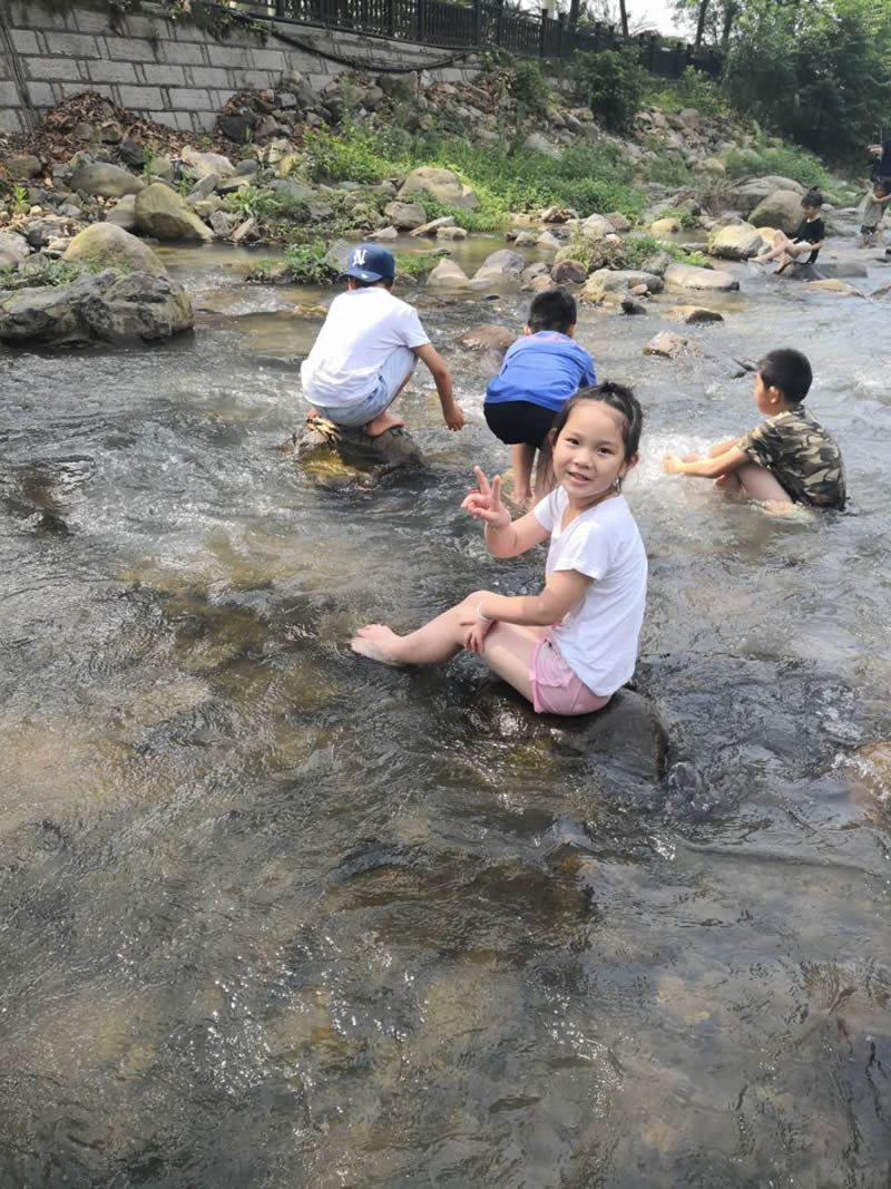 小孩們在大人們的帶領下,在潺潺的溪水中歡樂的玩耍,夏季炎熱的天氣,唯有戶外的清涼能夠帶來一絲絲的暢快。